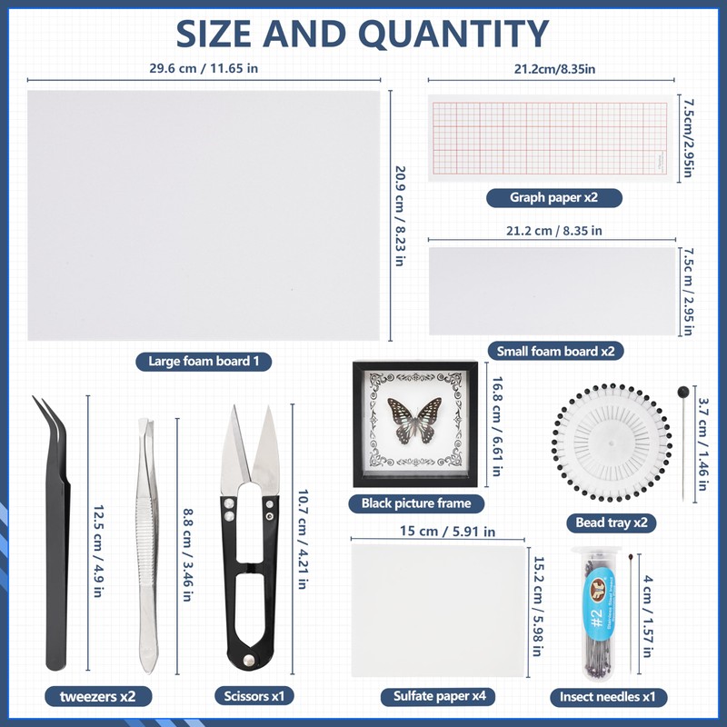 - Comprehensive Kit for Specimen Preparation.This kit includes 40 stainless steel #2 insect pins, bead needles, wings pressing paper, coordinate paper, and a U-shaped scissor, ensuring you have the right tools for precise insect mounting. The variety of pinning accessories helps both beginners and experienced collectors create professional displays