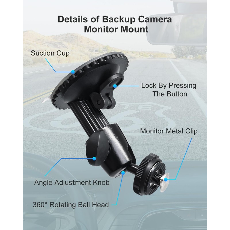 • 【Enhanced Suction with Strong Load-Bearing 】– This car backup camera monitor mount features a enhanced TPU suction cup with an increased size of 2.75 inches and built-in adhesion. With a weight capacity of over 5000g, it easily supports displays larger than 5 inches, ensuring safety even on bumpy roads
