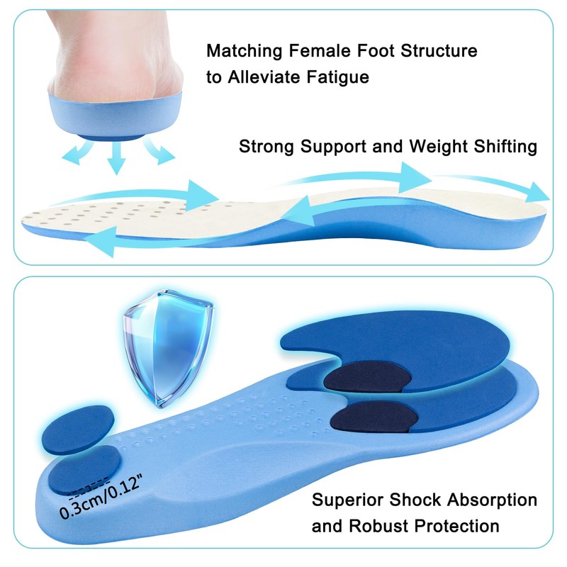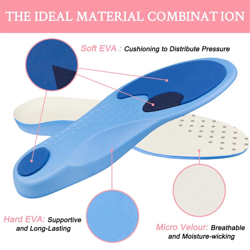 - Extra Support: With an anatomically shaped arch support and a heel cup, our insoles are crafted to harmonize with the foot's natural geometry, offering a premium fit for dynamic activities. This design also distributes body weight evenly, alleviating pressure points and improving stability in motion.
