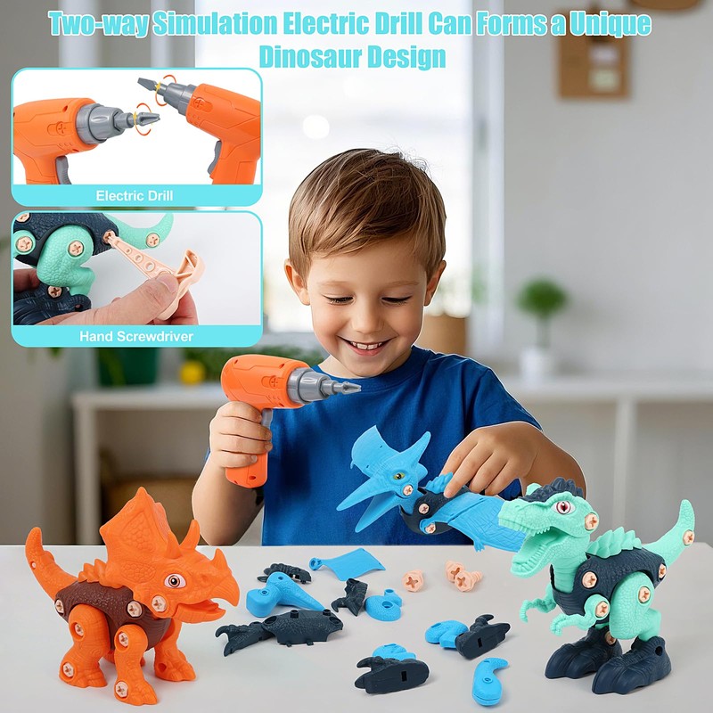 - Complete Dinosaur Architecture Set: Each detachable dinosaur toy set includes 3 dino, 1 electric drills, 2 drill bits, 3 manual screwdrivers, and clear assembly instructions. This step-by-step guide enables children to easily assemble toys, cultivate hands-on skills and hand eye coordination.
