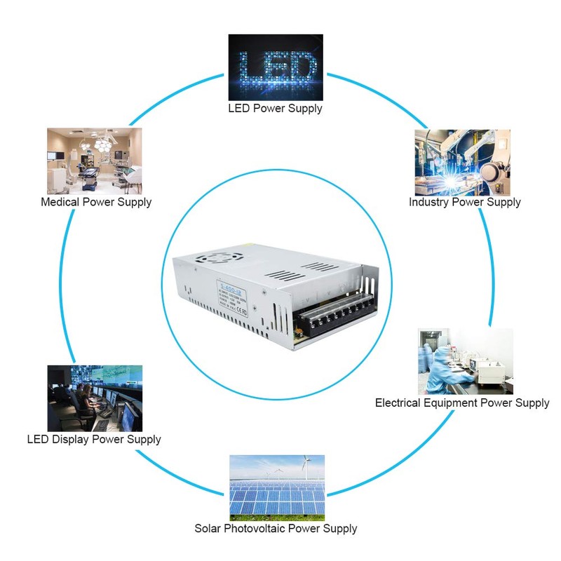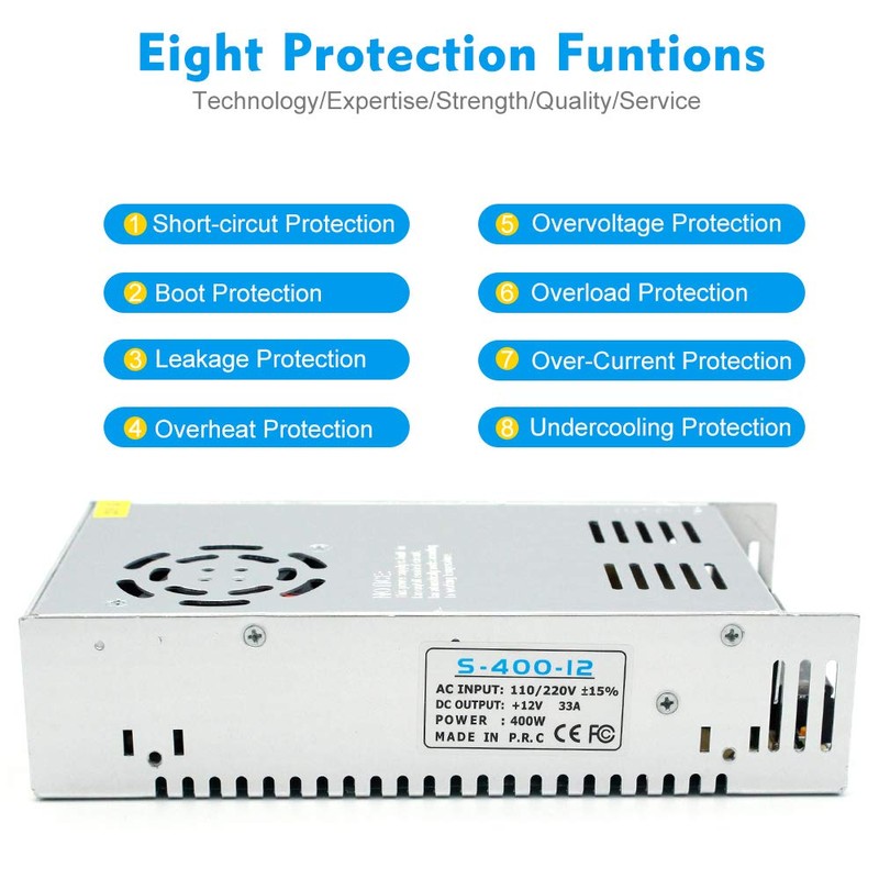 • Universal Input: 100-240V AC; Output: 12V DC 33A 400W. Suggestion: Used should not exceed 80% of the power of the 12 volt power supply