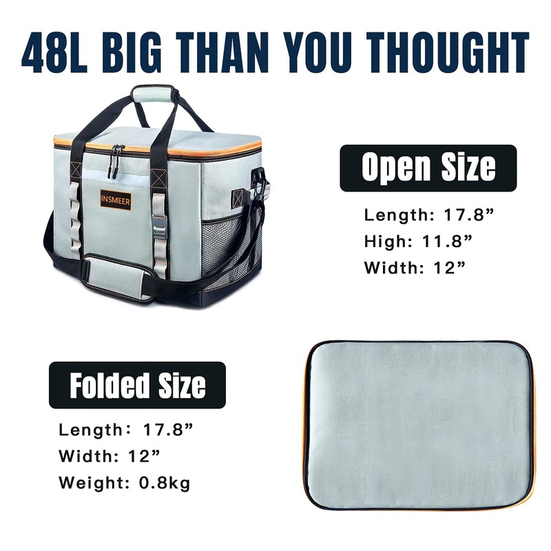 - INSMEER Large Cooler Bag Measures: 17"L x13.8"W x 11.5"H when open and folding flat to 3"; weighs 2.2 pounds when empty; lightweight cooler bag holds 65 cans (330 ml) by volume.