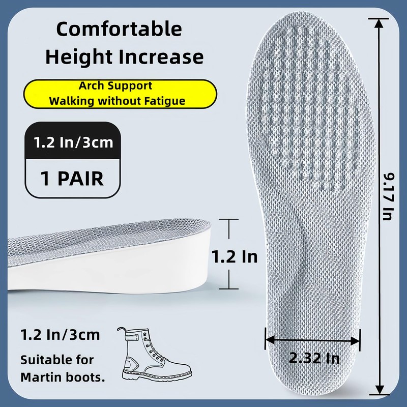 • ❤【Comfortable shock absorption without tiring feet】The height increase insolesis fit snugly against the sole of the foot, with arch support, providing a comfortable foot feel and preventing foot fatigue.There are various heights for height boosters, and you can choose the appropriate height according to your shoe type. The larger the space, the higher the insole height that can be accommodated in the shoes,suitable for sports shoes, casual shoes, high top shoes, boots.