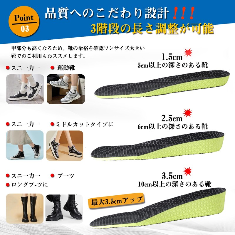 - (3 different heights) Choose from 3 heights: 0.6 inches (1.5 cm), 1.0 inches (2.5 cm), 1.4 inches (3.5 cm). Recommended for those who want to look tall and want to show their legs longer. This is a secret insole, just put it in your shoes and you will dissolve any problems in an instant. For 3.5cm please wear boots, 1.5cm for high-cut sneakers, 0.6inch for 1.5cm for sneakers, leather shoes, etc