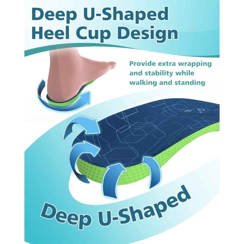 - 【FOOT PAIN RELIEF】With ergonomic high arch support design and cushion pad at the heel, these insoles focus on foot pain relief. They help alleviate metatarsalgia, joint pain, and back pain caused by plantar fasciitis, flat feet, achilles tendonitis, and heel spurs.