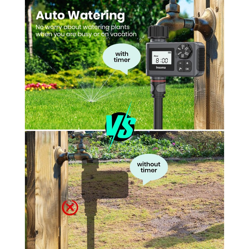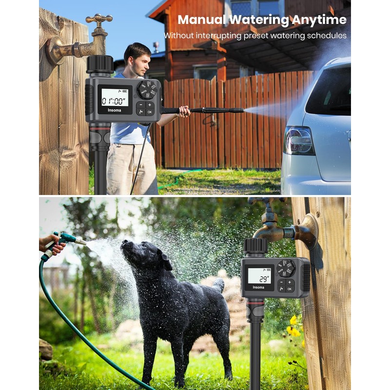 - 3 Watering ModesThe outdoor sprinkler timer has 3 watering modes to meet your different watering plans. Under Auto mode, the hose timer will run as the schedule you set before, no need to worry about watering plants when you go out the town. With Manual mode, you can use faucet to do other things from 1min to 23hours59 mins without interrupting your schedule. In rainy day, the rain delay setting helps you pause your schedule 1-7 days and will be automatically resumed, saving water and bills.