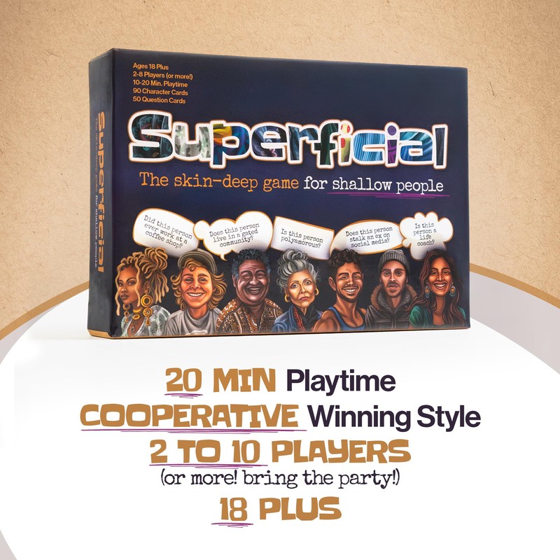 - While Superficial can’t be summed up in a sentence or two, here’s the gist. ● 30 character cards, including ONE “mystery person” are laid out face up. ● The players will then ask questions as judgey as a wealthy aunt in hopes of sussing out the mystery person. Sample questions such as: ○ Is this person a vegetarian? ○ Does this person shave their pubes? ○ Does this person play video games til 3am?
