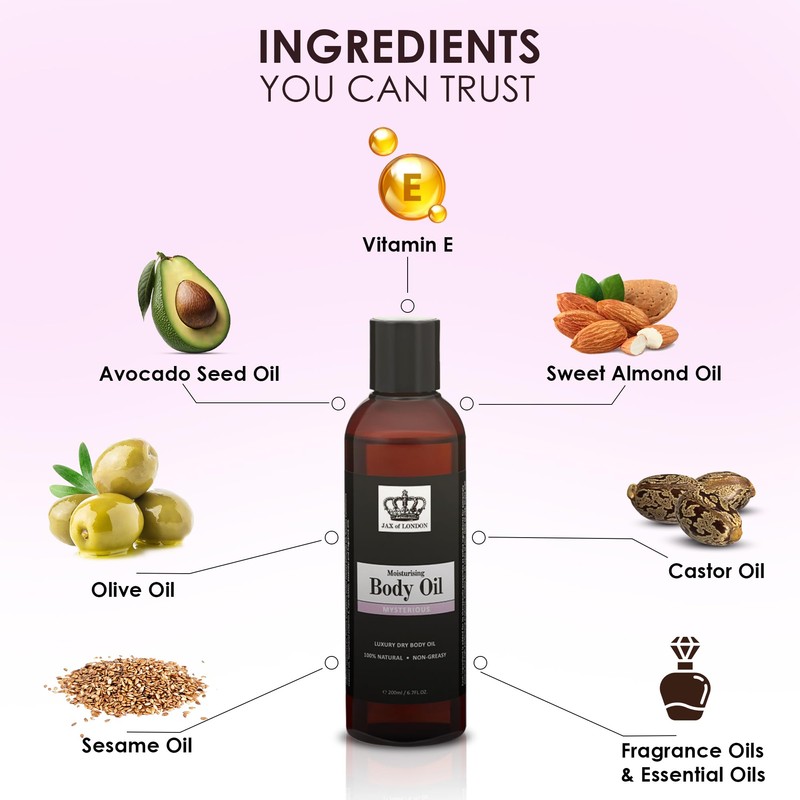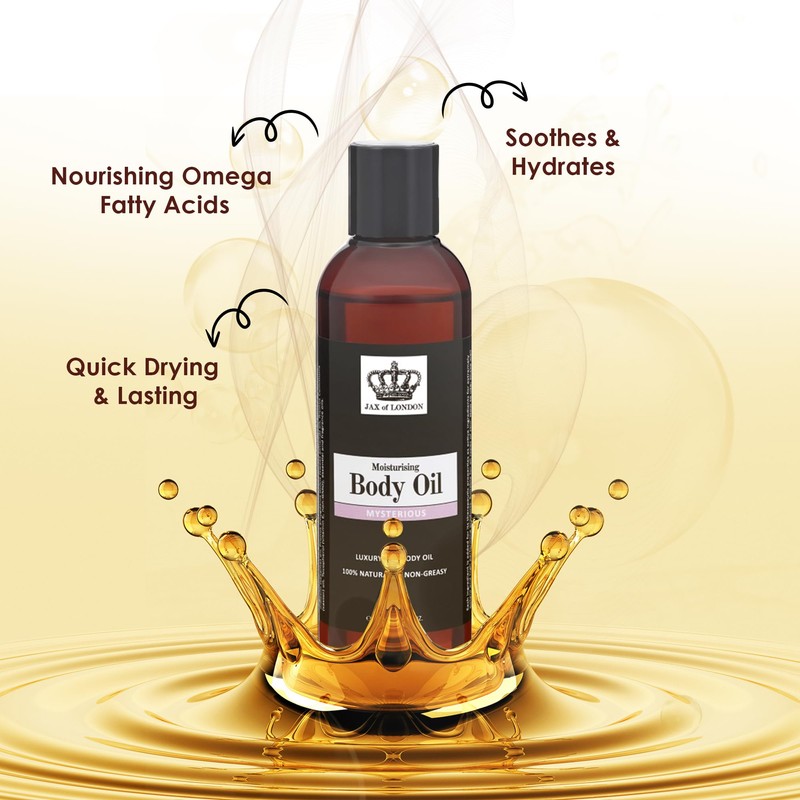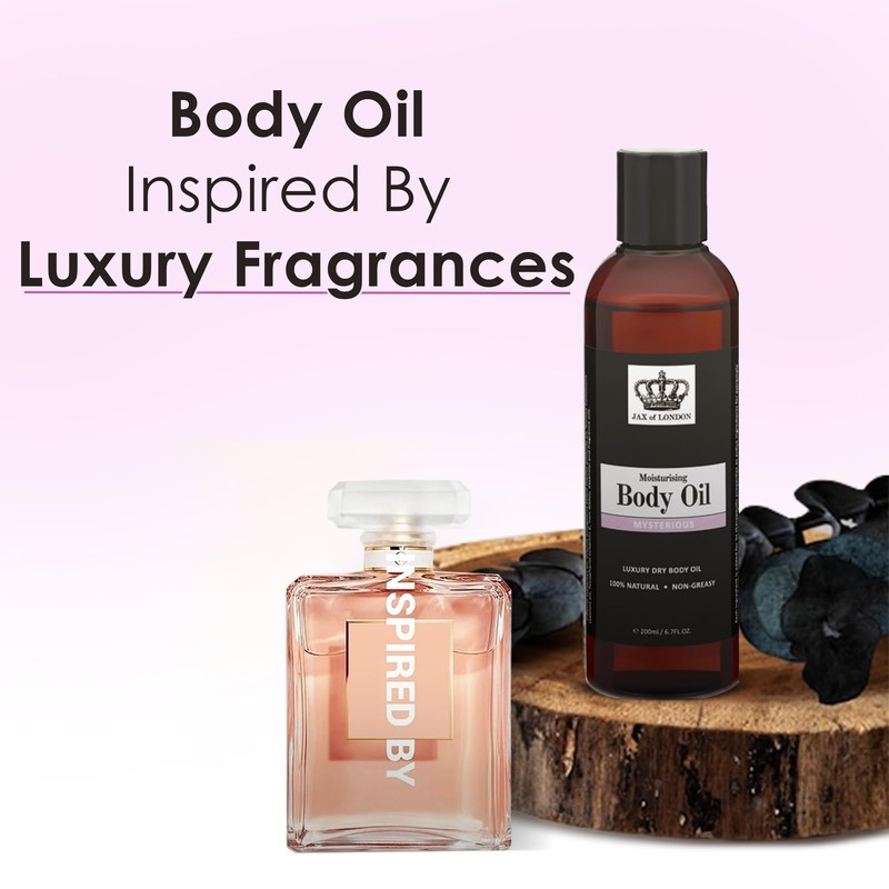 Inspired Body Oil Quick Dry Firming Stretch Marks Moisturiser Massage Aromatherapy Odour Amazing by Jax of London 200ml (Mysterious)