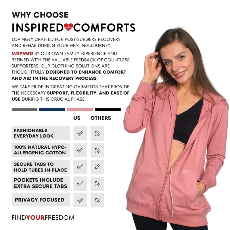 - [ Thoughtfully Designed to Support Mastectomy Recovery ] The ZIP CLOSURE design allows effortless access to the drain pockets. Our hoodie features INTERNAL pockets that hold up to FOUR JP drains (two on each side)