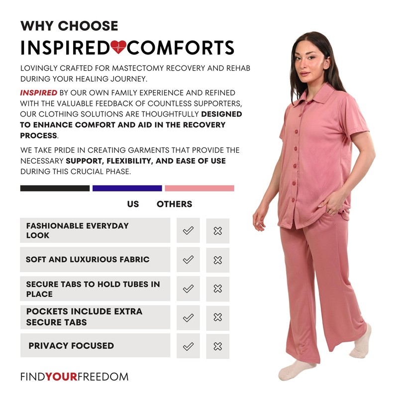 Inspired Comforts Post Surgery Mastectomy Recovery Pajamas Set with Internal Drainage Pockets, Pink, Large