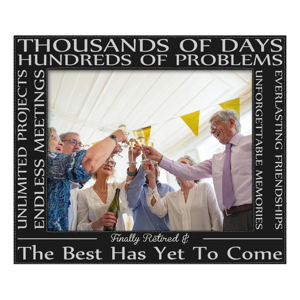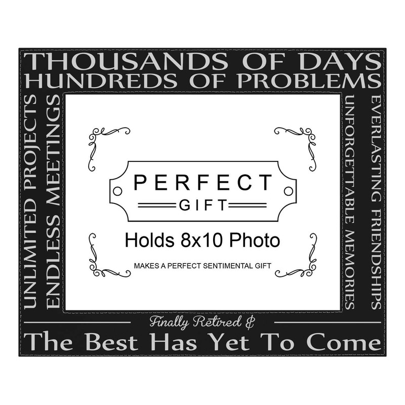 Makes a perfect gift for a retiring coworker or friend. Laser engraved leatherette frames make excellent retirement gifts for women, retirement gifts for men and is ideal for retirement party decorations. This leatherette frame offers the look and feel of genuine leather at a fraction of the price. This richly textured, synthetic material is water resistant, easy to clean and durable enough for the rigors of daily use. The high quality workmanship of each leatherette piece is sure to impress every recipient with its elegant individuality. This frame is suitable for 8x10 photos and measures 10.75" x 12.75" with a 7.5" x 9.5" photo opening. Made with a stitched border this faux leather (leatherette) frame has vivid coloration and contrast. The frame includes a glass front and can be displayed hanging or standing with built in hook and desk stand easel. To clean, use water and soap. It will not leave water spots. Alcohol works well on pen marks. Will not absorb finger oil. This beautifully crafted picture frame is designed and engraved in the USA.
