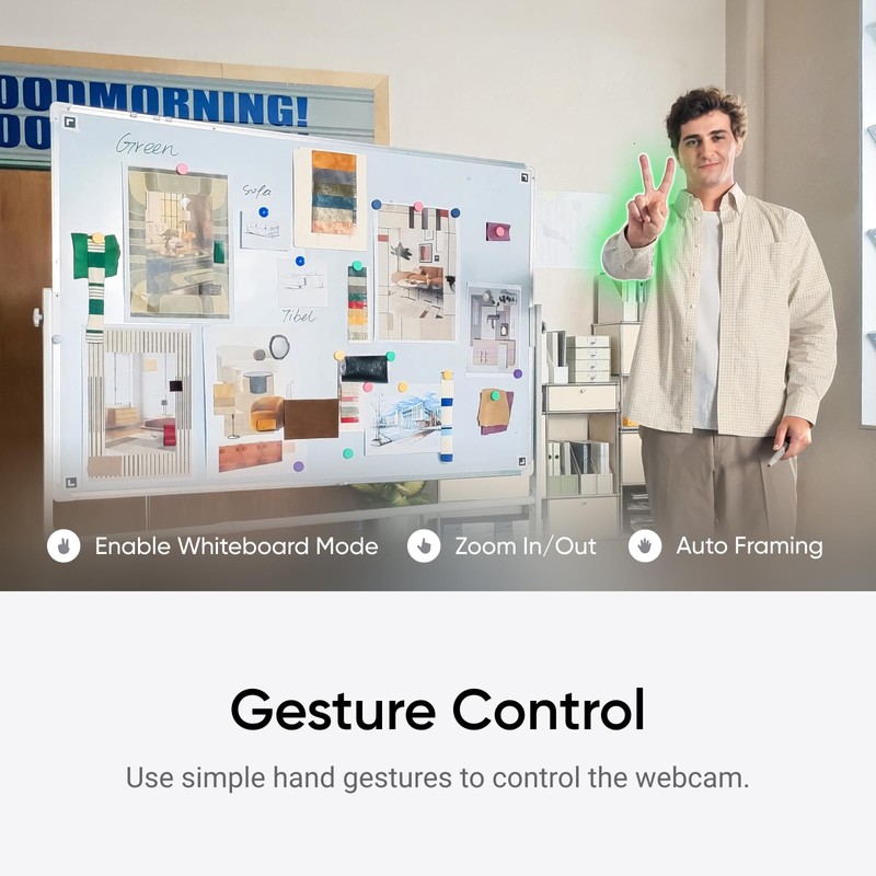 - Gesture & Remote Smartphone Control: Control your webcam remotely from your smartphone, or use simple hand gestures to start AI Tracking/Auto Framing, zoom in or out and activate Whiteboard Mode.