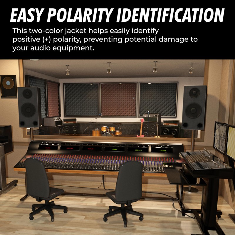 - EASY POLARITY IDENTIFICATION - This single color jacket has a silver stripe on one side to help identify the positive (+) polarity. Making a polarity mistake could be damaging to your audio equipment.