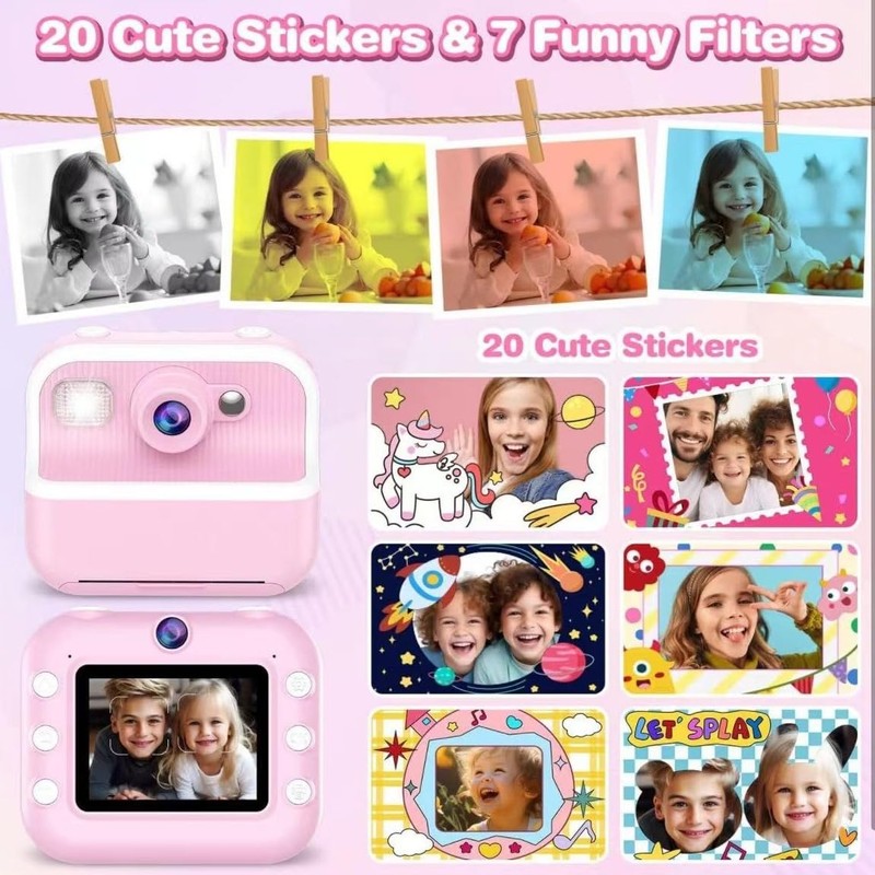 - 【Instant Print Camera】: Capture fun experiences with dual front and rear cameras!Print black-and-white photos in just 1 second, while color images save to the 32GB SD card.20 photo frames, 7 filters,this camera sparks creativity and transforms snapshots into cherished keepsakes.