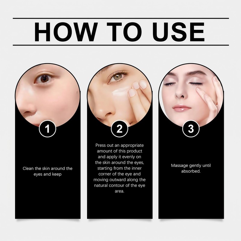 - HOW TO USE:Using the eye wrinkle cream instant results is simple.Start with clean,dry skin and apply some eye tightening cream instant to the eye area.Gently pat temporary eye tightener in with your fingertips.For best results,use eye tightening cream daily before your daytime moisturizer.This eye bag cream is designed to work quickly,providing immediate relief and long-lasting benefits