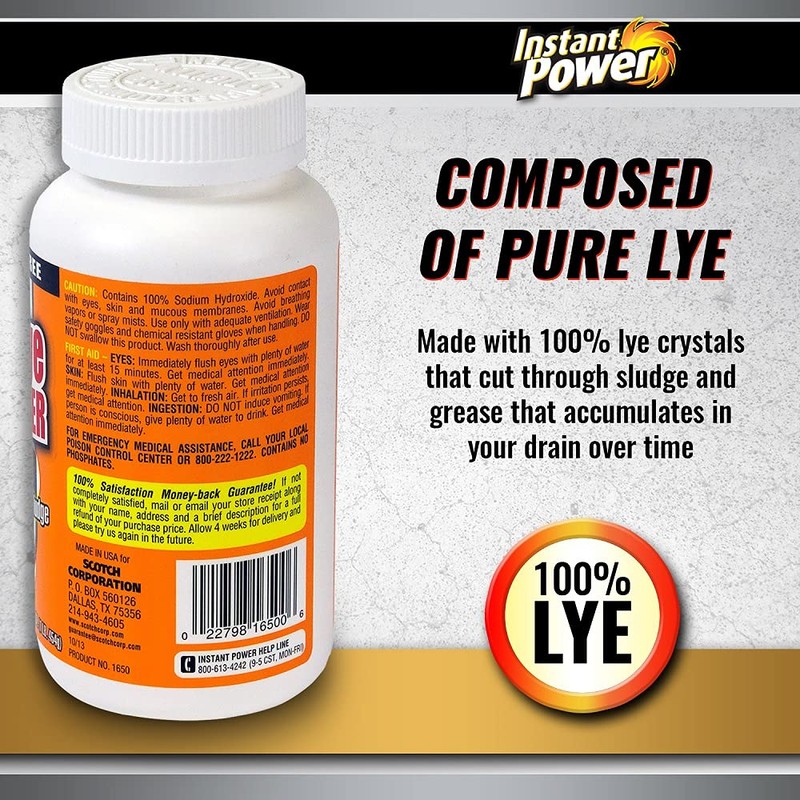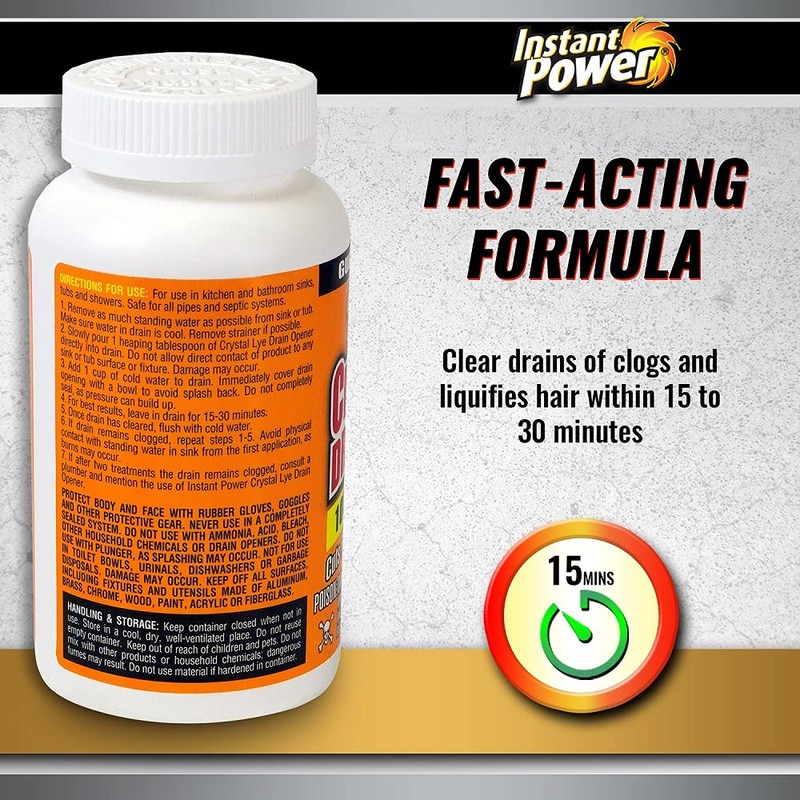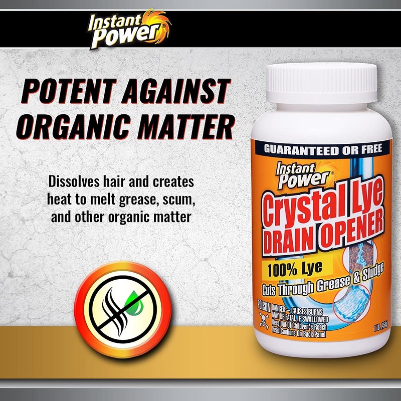 - Product Specifications: The Instant Power Lye Drain Opener is available in a 1 lb. bottle with recommended, user friendly instructions on the back