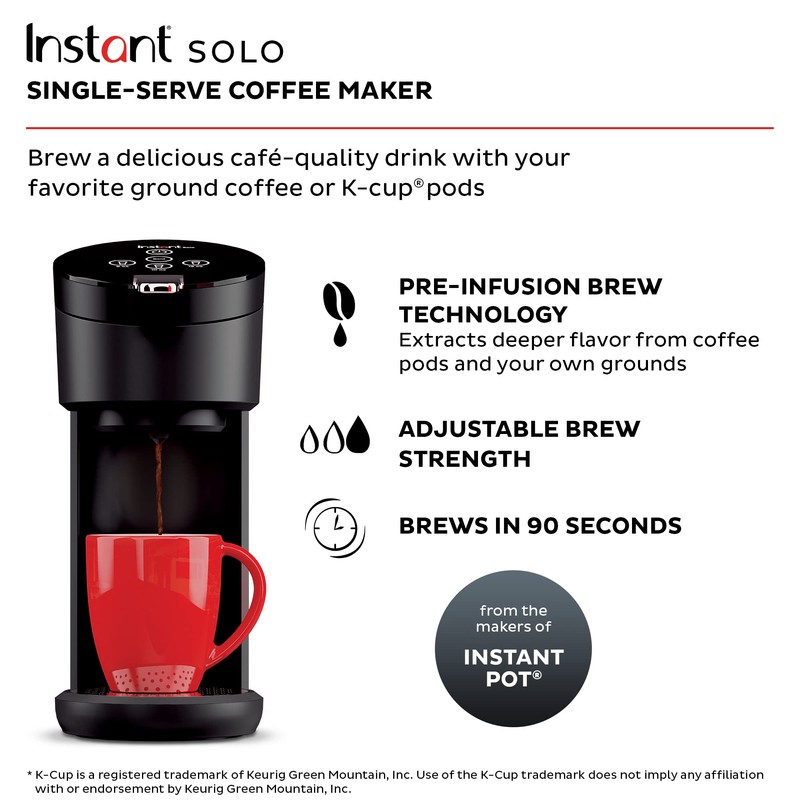 Instant Solo Single Serve Coffee Maker, From the Makers of Pot, K-Cup Pod Compatible Brewer, Includes Reusable & Bold Setting, Brew 8 to 12oz., 40oz. Water Reservoir, Black