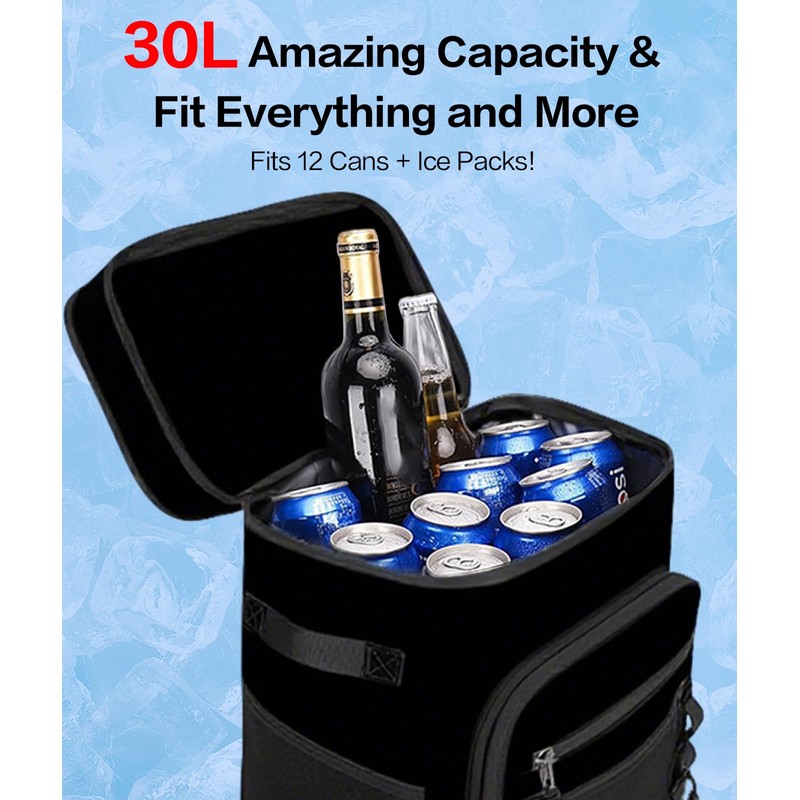 Insulated Cooler Backpack 30L - Leakproof & Lightweight, Keeps Ice 24+ Hours for Camping, Beach, Hiking, Picnics - Includes Bottle Opener & Side Pockets (Black)