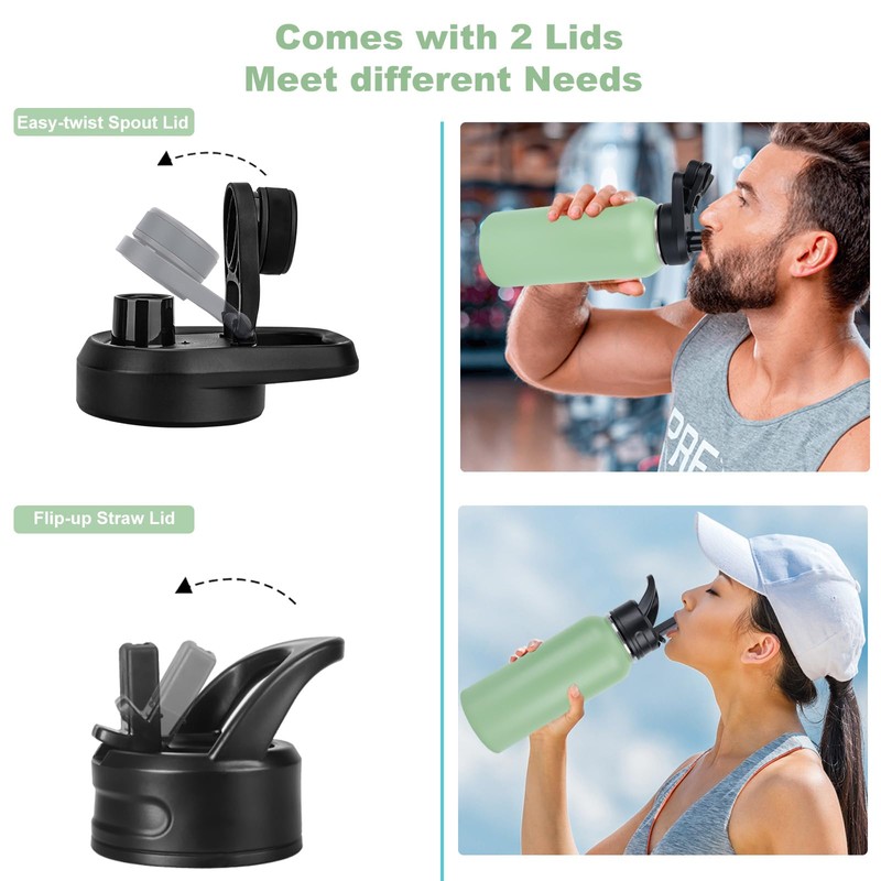 - [STRAW & SPOUT LIDS] Our reusable water bottles comes with 2 lids: a easy-twist spout lid and a flip-up straw lid, these 2 lids both have inner food-grade silicone stopper gasket, which prevents leaks and spills and meet your different needs.Plus, both 2 lids build-in handles, which is load-resistant, easy to carry, give you a portable travel.