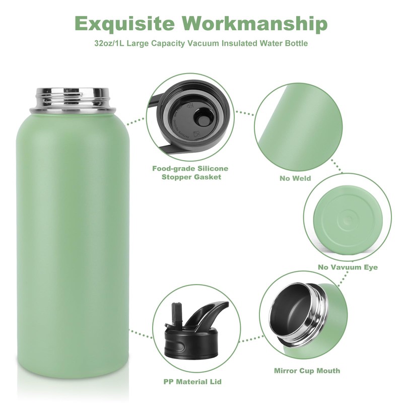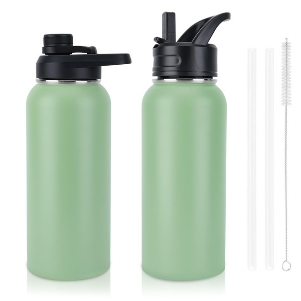 Insulated Water Bottle, 32oz Vacuum Stainless Steel Metal Sports Water Bottles with Stickers, Straw & Spout Lid (2 Lids), Double Walled to Keeps Hot and Cold, Leak Proof, BPA-Free, 32oz (Saga Green)