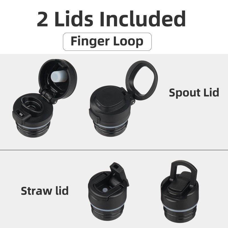 - The bottle comes with 2 lids for different uses.The straw lid with a finger ring is for cold beverages, while the pop lid with a small loop is for sipping hot drinks.Both lids are leak-proof and ensure the bottle easy to carry