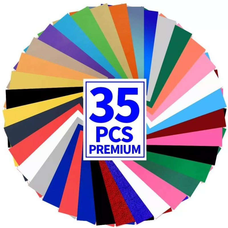 The HTV heat transfer vinyl includes 35 sheets with custom SIZE 12" x 10".HTV vinyl is easy to layer and distinguish the cutting side.due to the different display,