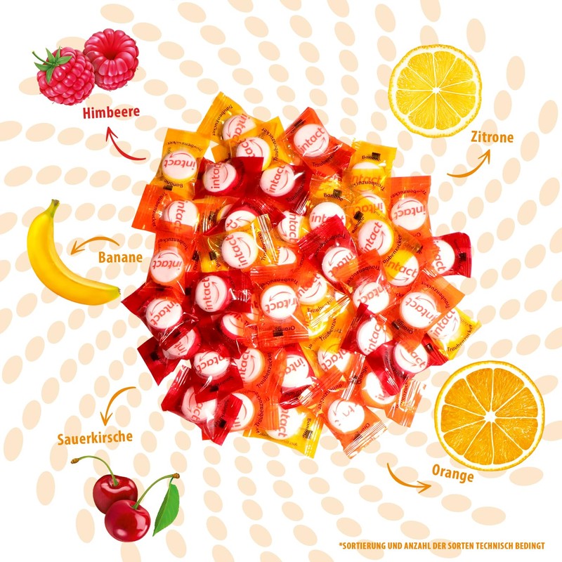 - INTACT Fruit mix grape sugar sweets in a bag – The classic among glucose with additional vitamin C: delicately melting, delicious intact glucose sweets for in between and on the go. The popular fruit mix with the flavours lemon, orange, raspberry, banana and sour cherry ensures a varied and fruity treat.