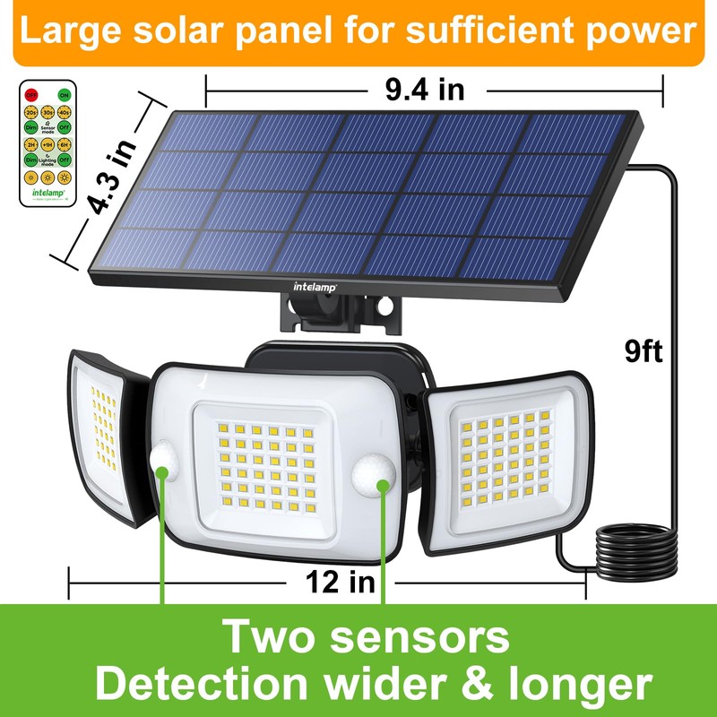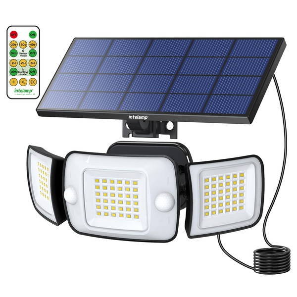 intelamp Solar Lights Outdoor, 3 Head Solar Motion Sensor Lights for Outside, IP65 Waterproof Security Flood Lights, Separate Solar Panel with 9FT Cable Remote Control (1)