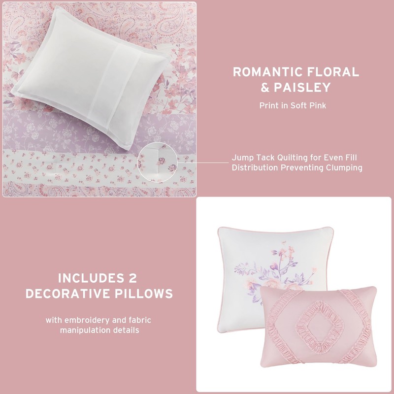 Intelligent Design Queen Comforter Set, Romantic Floral & Paisley, Solid Reverse, Microfiber Lightweight All Seasons Down Alternative Bedding, Sham & Décor Pillows, Oliena, Full/Queen Pink 5 Piece