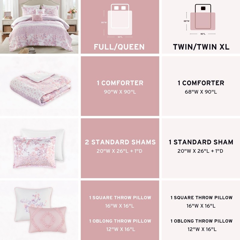 - Full/Queen size comforter set - 1 Comforter 90"W x 90"L, 2 Standard Shams 20"W x 26"L + 1"D (2), 1 Square Throw Pillow 16"W x 16"L, 1 Oblong Throw Pillow 12"W x 16"L * Shipped in a smaller compressed packaging to reduce carbon footprint