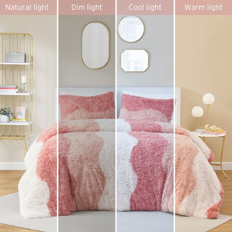 - The Cassie Shaggy Faux Fur King Duvet Cover Set showcases a unique tonal wave striped pattern for an ombre look, and reverses to a soft blush color on a brushed microfiber for the perfect warmth and coziness