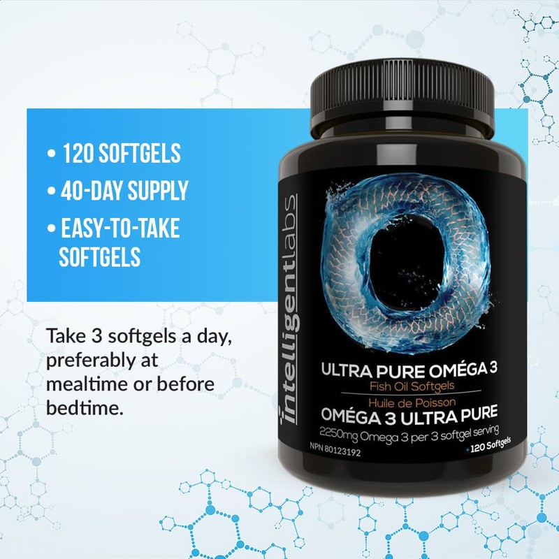 Intelligent Labs Intelligent Labs Triglyceride Omega 3, 2250mg per 3-Capsule Serving, Burpless Fish Oil Capsules, 120 Softgels Per Bottle