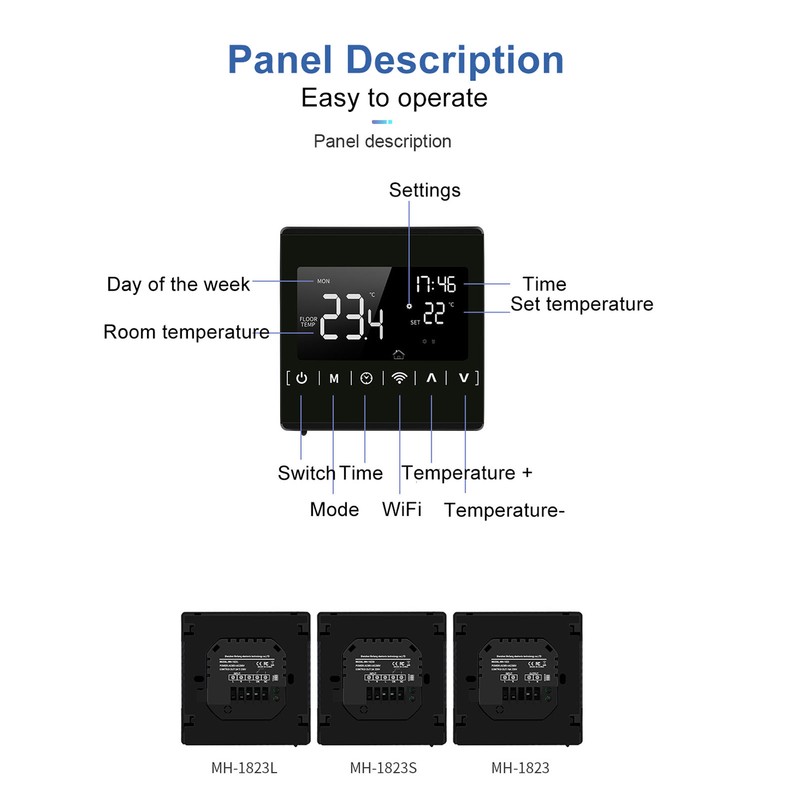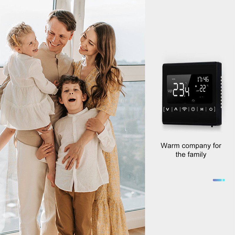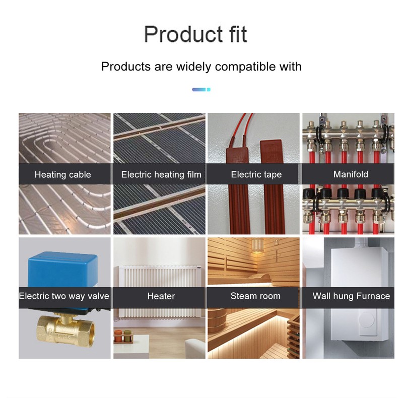 1、Multifunctional:The intelligent thermostat has functions such as temperature collection display, temperature compensation, anti freeze protection, high temperature protection and APP remote control. 2、Wide Application: The intelligent thermostat can be used to control underfloor heating devices with built in sensors for room temperature measurement and control of the room temperature, preventing the heating devices from burning out due to high temperatures. 3、LCD Large Display: The intelligent thermostat has a large LCD high definition screen accuracy liquid crystal display, high accuracy temperature control, stable performance and compact design. 4、Easy Control: The display of this smart thermostat can be turned on with one touch manually. You can also easily control multiple smart thermostats with one mobile phone or one smart thermostat with multiple mobile phones. 5、APP Remote Control: You can use your mobile phone to control your various home appliances remotely via the for Tuya app, making your home smarter. 6、Working Principle: The intelligent thermostat uses control of the gas stove form, for example, a controller is installed in each room with a linkage signal, all connected, connected to the top of the gas stove, the first room temperature is reached, it breaks the solenoid valve, the temperature of other rooms is not reached, the gas stove continues to work, and so on all rooms temperature is reached, the gas stove stops. 7、Protect Personal Scurity: Furnace heating is different from ordinary electric heating and water heating, it produces heat in the case of a gas furnace, and the wiring method is different from electric heating, compared to electricity, furnace heating is less afraid of electric shock than electric heating, more protective of personal security.