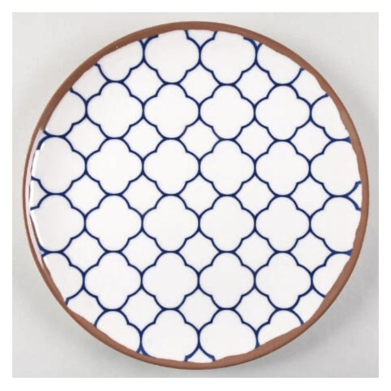 Add a touch of elegance to your dining experience with this beautiful Morrocan Blue Pattern dinnerware set from Intensa Home. The four-piece set includes a dinner plate, salad plate, cereal bowl, and pasta bowl, accommodating a total of four place settings. The porcelain dishes are embossed with a stunning white and blue pattern, finished with trim brown accents for a touch of sophistication.