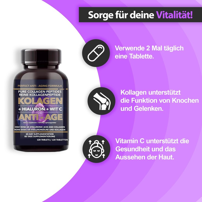 - Ein natürliches Nahrungsergänzungsmittel mit Kollagen, Vitamin C und Hyaluronsäure, das für Vitalität, ein jugendliches Aussehen der Haut und eine vollständige Ernährung sorgt.