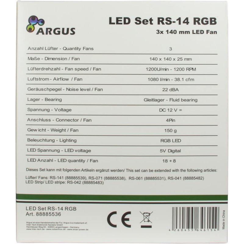 Inter-Tech Fan 140 x 140 x 25 mm Argus RGB Fan Set RS-14 3 Pieces 88885536