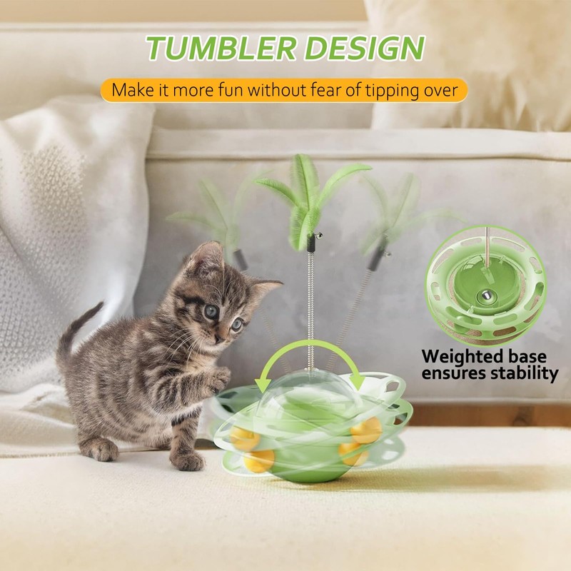 - 【4-in-1 Fun for Cats】An upgraded design of the interactive cat toy, with three ways to play: chase, pounce, and ambush. The spinning ball stimulates your cat's senses, the bouncing feather sticks inspire hunting instincts, and the spinning turntable encourages your cat to chase. All of these allow your cat to get enough exercise. There is also a food storage space, making your cat's feeding time fun and rewarding.