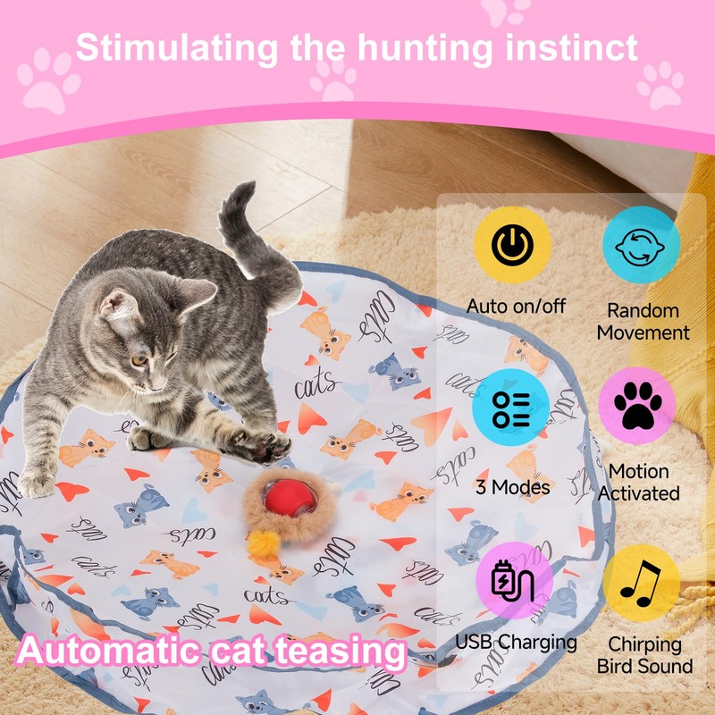 Interactive Cat Toy Ball Fast Rolling in Pouch, Automatic Cat Toys Motion Activated Simulated Chirping Bird Sound Cat Toy Hide and Seek Mouse Cat Game,Moving Cat Toy for Indoor Cat White Mat Red Ball