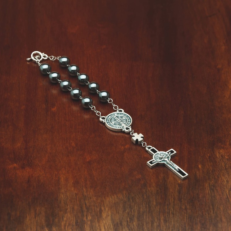 Intercession Hematite Car Rearview Mirror Rosary (St Benedict)