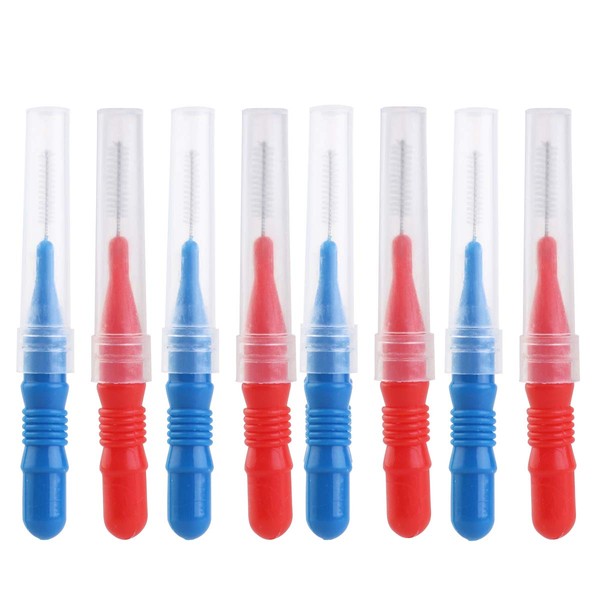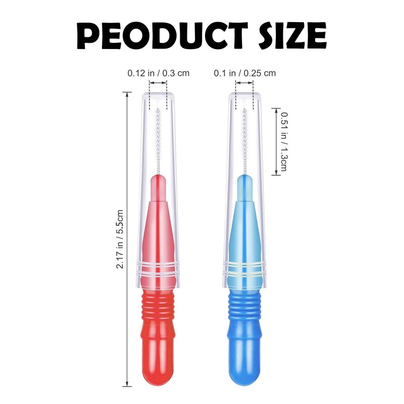• 【2 Sized dental brushes Heads】The diameter of brush heads in diferent colors is slightly different. The blue brush has 2.5mm brush head for 0.8-1.0mm toot spacing; The red brush has 3mm brush head for 1.0-1.2mm tooth spacing.Satisfying everyone's oral interdental cleaning.