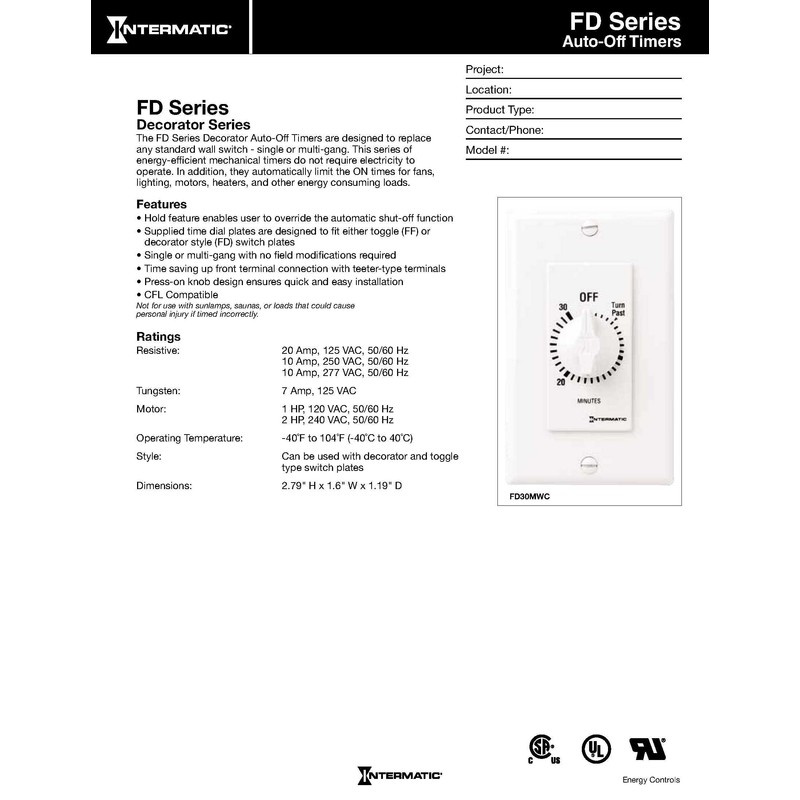 Intermatic FD60MAC 60-Minute Spring-Loaded Wall Timer for Lights and Fans, Al...