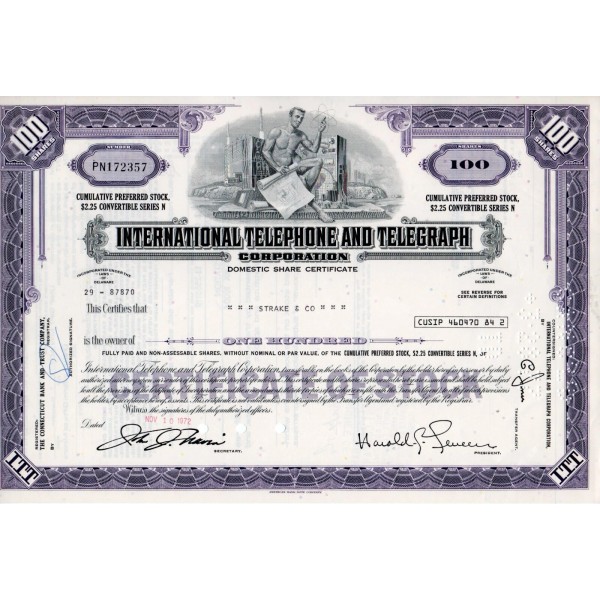 International Telephone And Telegraph Corp. Preferd Stock Certificate 100 Shares