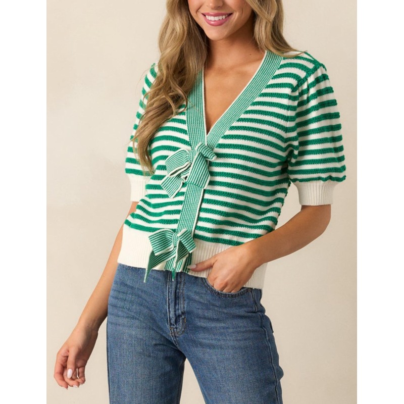 - Feature: This cute cropped pullover sweater designed with v-neckline, decorative front bows, loose fit puff short sleeves, rib knit cuffs and hem, chic but comfortable, trendy striped pattern, relaxed fit