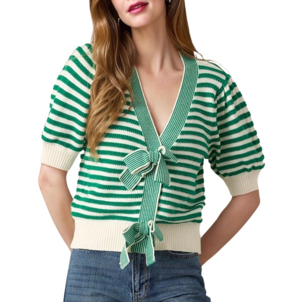 InterNos Womens Bow Front Short Sleeves Sweater Classic Striped V Neck Cropped Knit Pullover Tops(0986-Green-L)