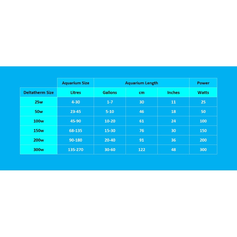 - 50 W model for aquariums from 23 to 45 litres, heater dimensions 26.3 cm x 2.5 cm x 2.5 cm