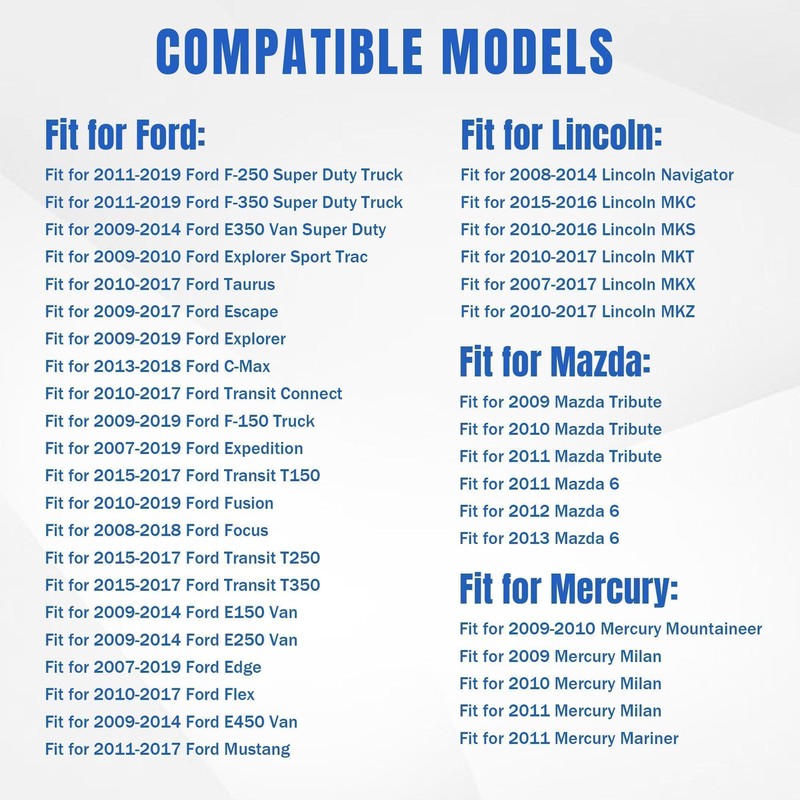- Ajuste: apto para Ford C-Max 2013-2018; apto para Ford E150 Van 2009-2014; apto para Ford E250 Van 2009-2014; apto para Ford E350 Van Super Duty 2009-2014; apto para 2009-2014. Ford E4500 Van; apto para Ford Edge 2007-2019; apto para Ford Tauro 2013-2017; apto para 2013-2017 Police Interceptor Utility; apto para Ford Tauro 2010-2017; apto para Lincoln MKC 2015-2016; 2011 201Lincoln MKS 0-2016; apto para Lincoln MKT 2010-2017; apto para Lincoln MKX 2007-2017; apto para Lincoln MKZ 2010-2017