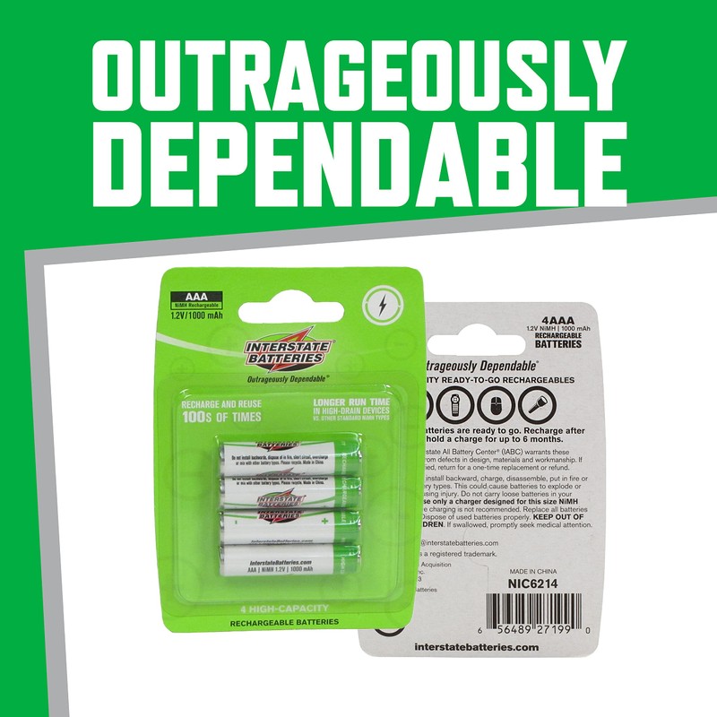 Interstate Batteries AAA Rechargeable Battery (4 Pack) Radios, Cameras, Controllers, (NIC6214) All-Purpose Battery 1.2V 1000 mAh NIMH