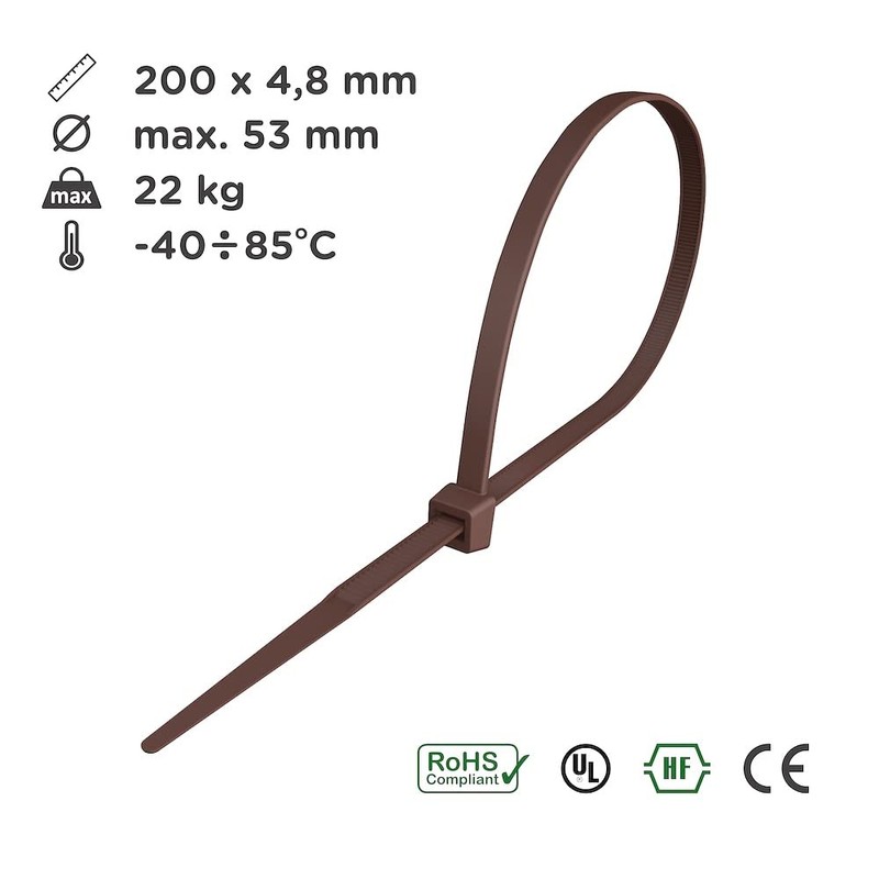 - 200 pieces brown cable ties from intervisio, dimensions 200 mm x 4.8 mm, brown - dark brown, tensile force 22 kg, max. Bundle diameter: 53 mm
