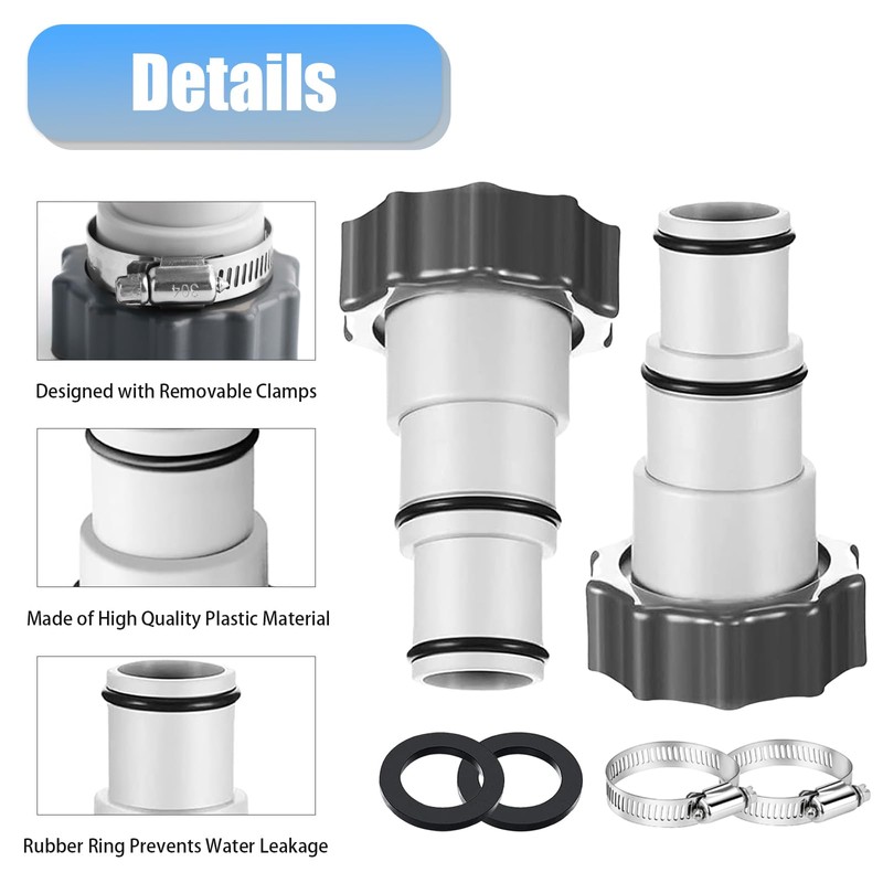 • 【High Quality Material】1.25" to 1.5" Replacement Pool Adapter is made of corrosion-resistant plastic material, sturdy and durable. The rubber ring fits tightly with the 1.25 inch hose to form a sealing space to prevent water leakage, ideal for pool connection kits.