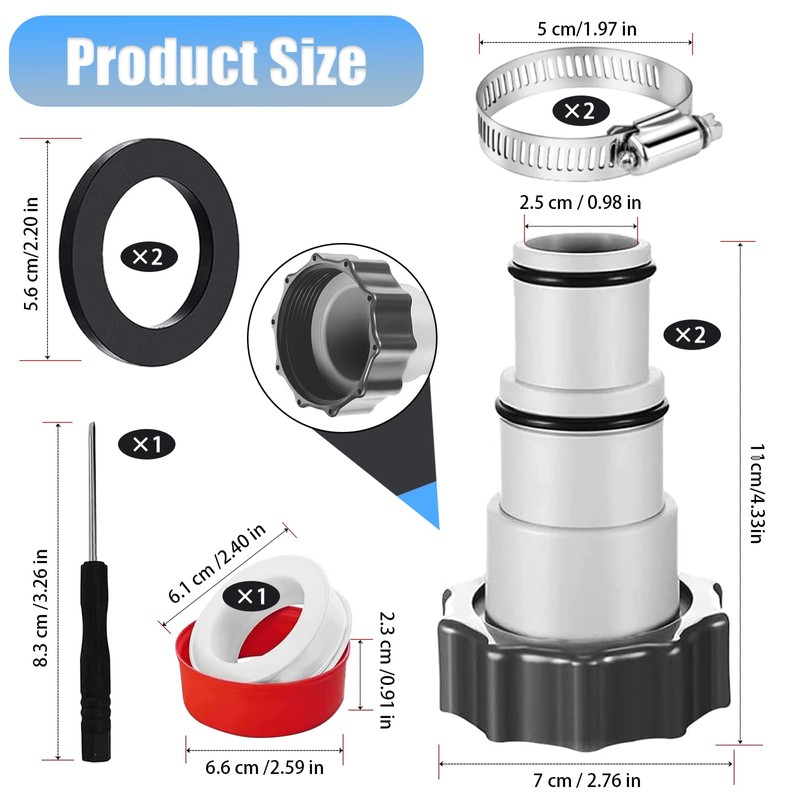 • 【Product Packaging】The Adapter A for Intex Pool kit contains 2 x Pool Hose Adapter for Pumps, 2 x Throat Clamps, 2 x Gaskets, 1 x Screwdriver and 1 x Roll of Raw Material Tape. These tools are able to meet most of the connection needs, convenient for you to install and adjust.